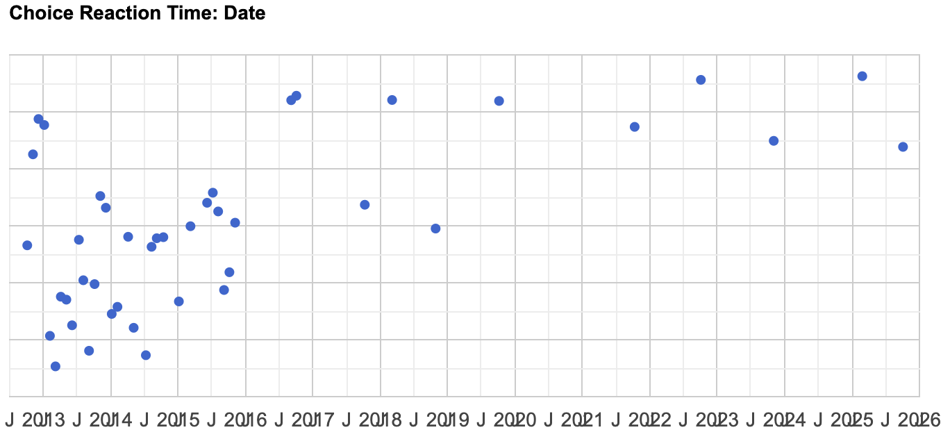 The common wisdom I had absorbed, based mostly on these cross-sectional studies, was that fluid intelligence peaks in one's 20s and sharply declines from there, while crystallized intelligence slowly builds over time. That's part of what this whole Quantified Mind aging tradition was all about: try to find the signs of that supposed 30s decline. I haven't seen any, which has been a little surprising under my old paradigm, but which would be fully expected if one accepts this argument, which seems rather obvious now that it's pointed out (how have I not have heard it before?).